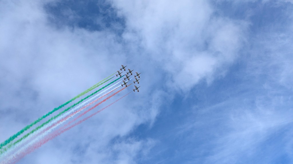 The Frecce Tricolori known as 313° Gruppo Addestramento Acrobatico Pattugila Acrobatica. They are the world’s largest aerobatic patrol, typically flying a formation of 10 aircraft.