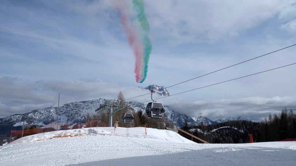 Italian President Sergio Mattarella was in attendance at the venue today so a special flypast was arranged. A great celebration for an Italian gold medal in the Super G!