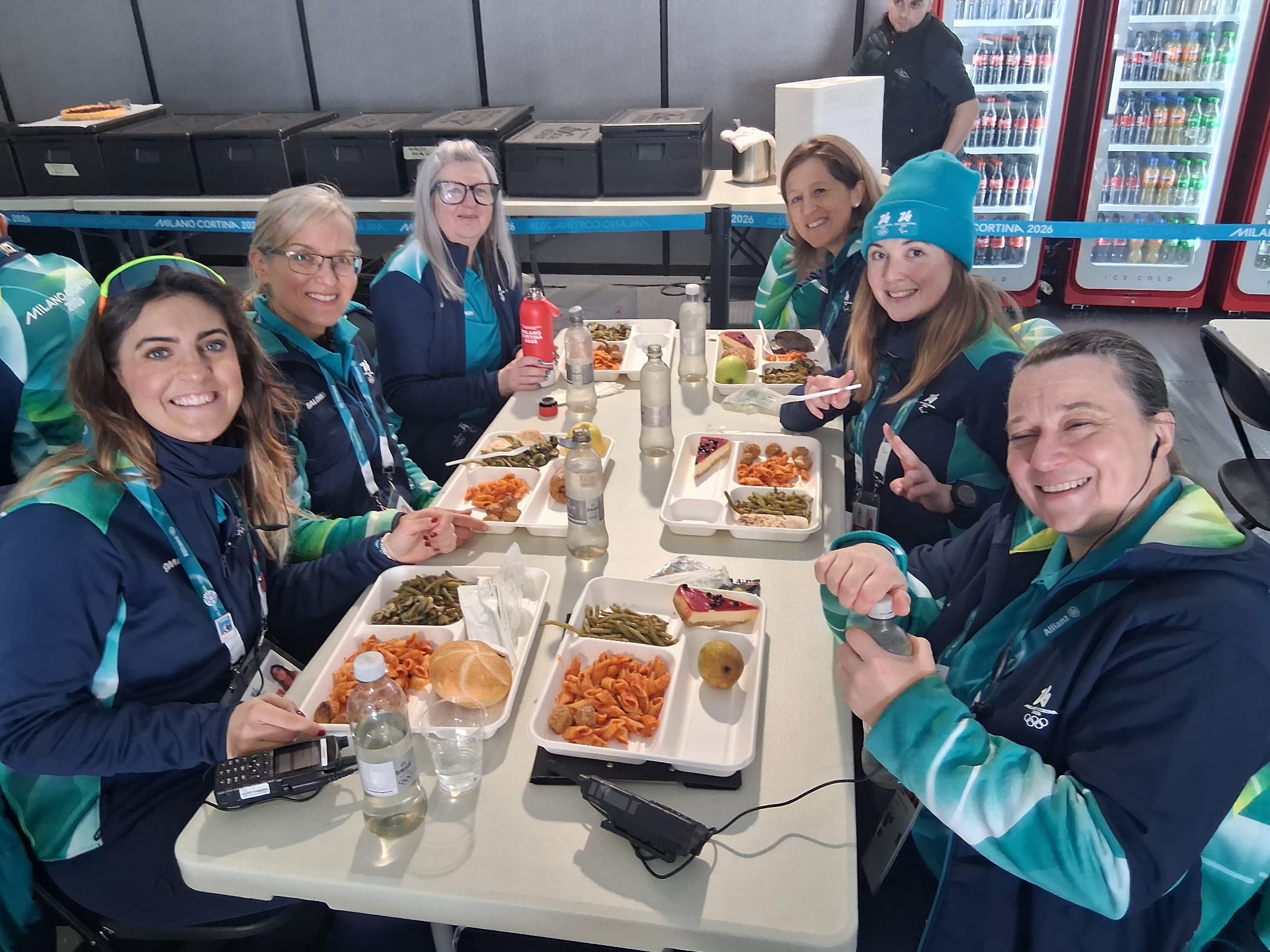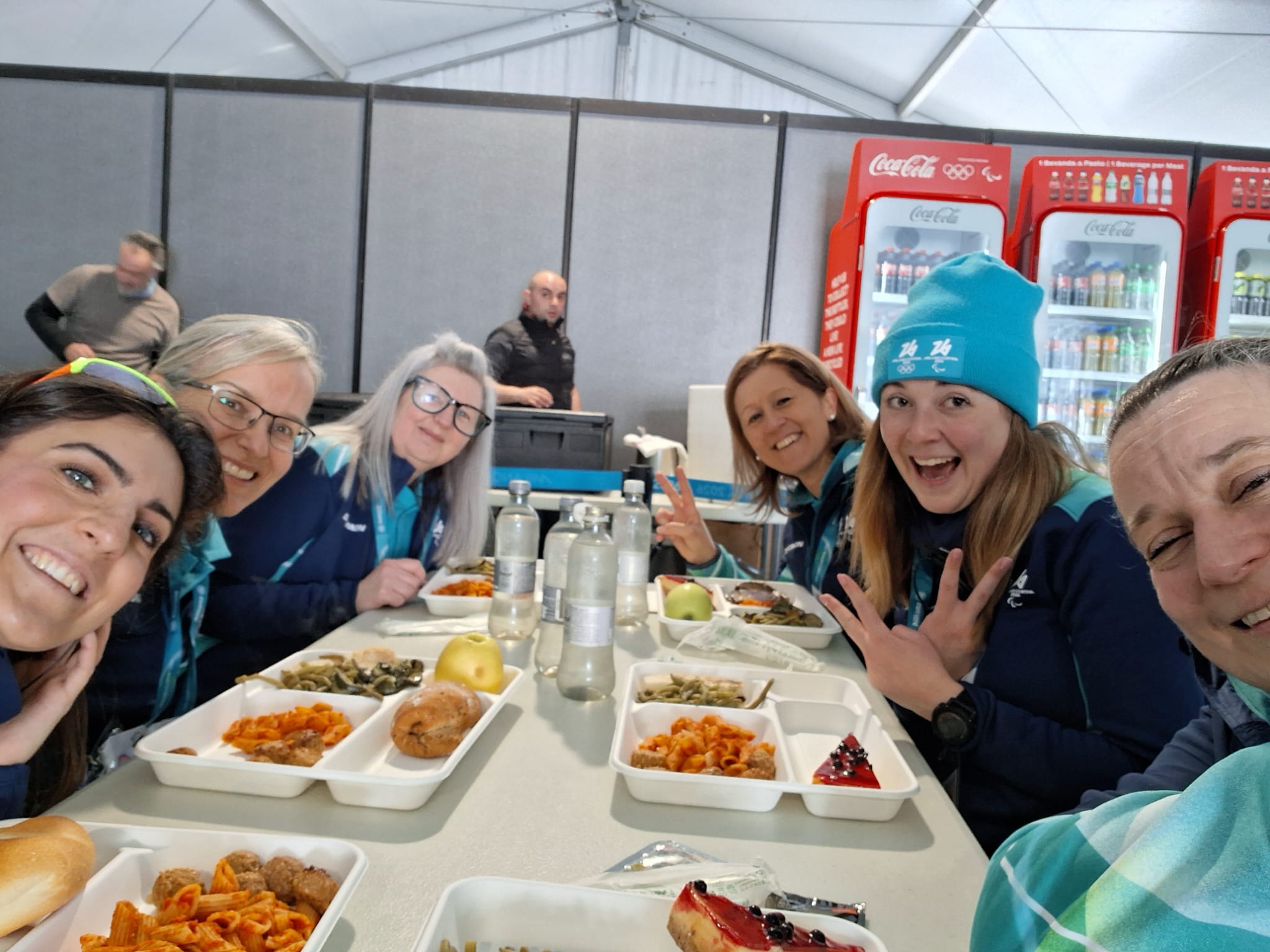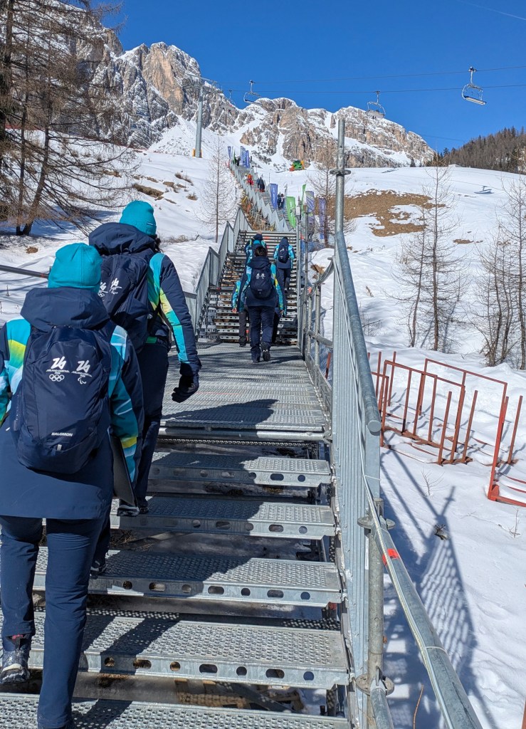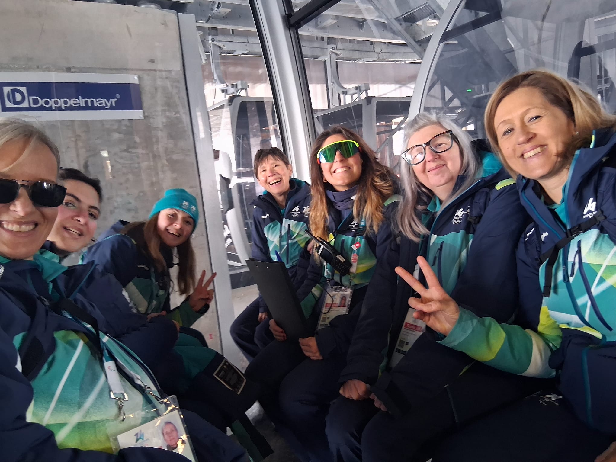 What a great team – Georgia (GG), Sara, Chiara, Laura 1, Gena, Karen & me. What a fun way to get to work, beautiful views!. They say what goes up must come down! after a gondola ride to a plateau, we then have to climb down to get an early lunch at 11 ready for racing to start at 12.